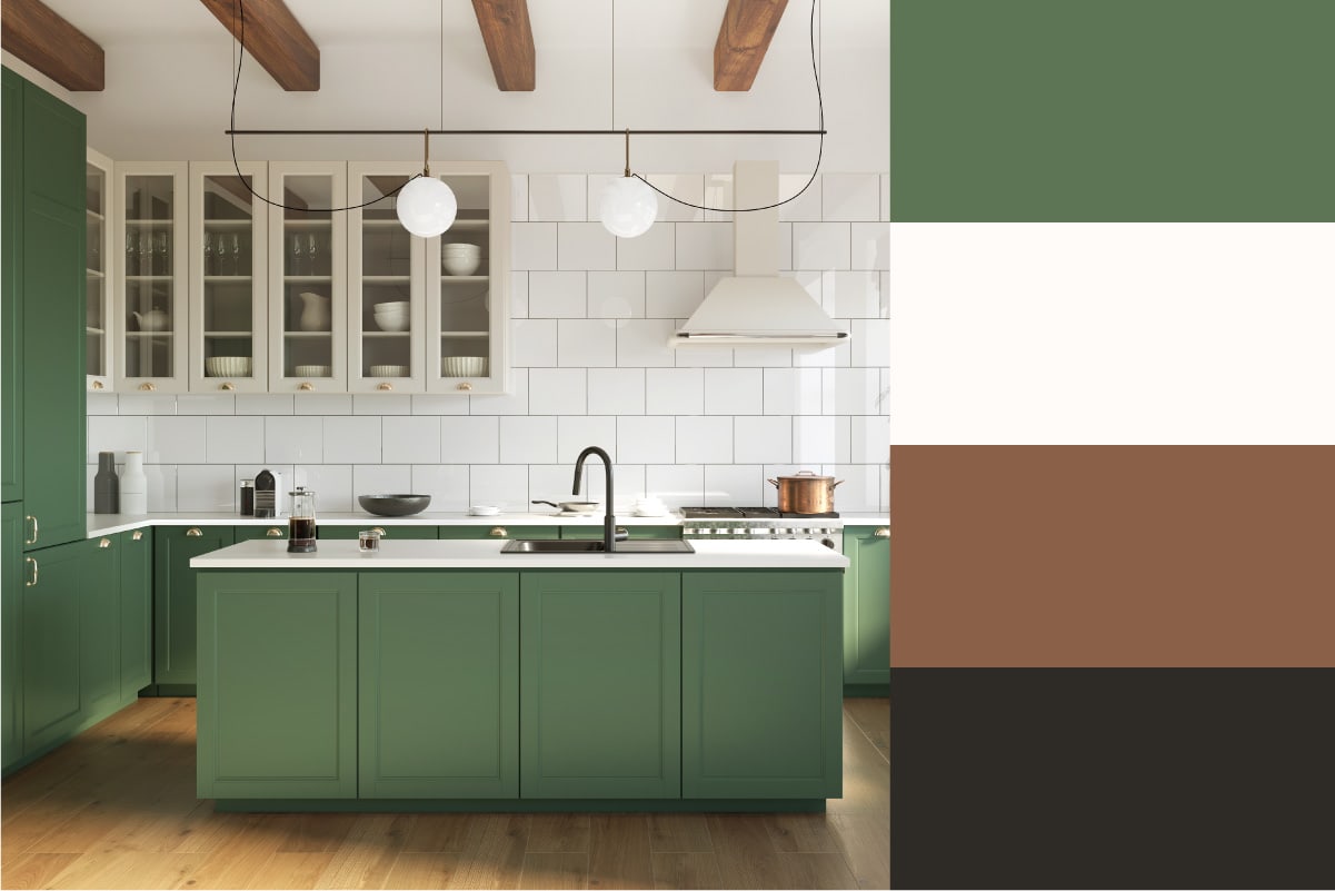 These green kitchen cabinets really stand out from the white subway tile walls and wooden ceiling beams. If you donโt want to commit to painting your cabinets, choose wallpaper or even a colored tile backsplash.